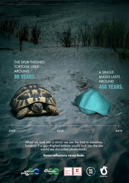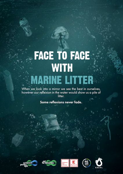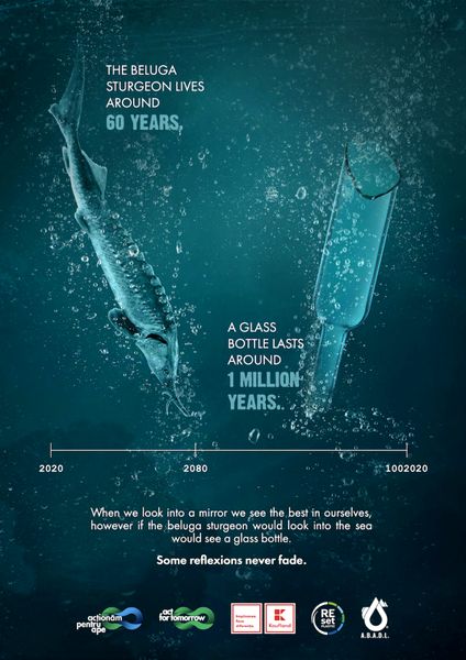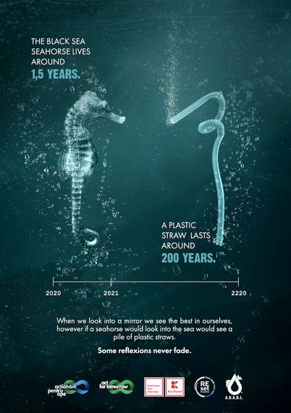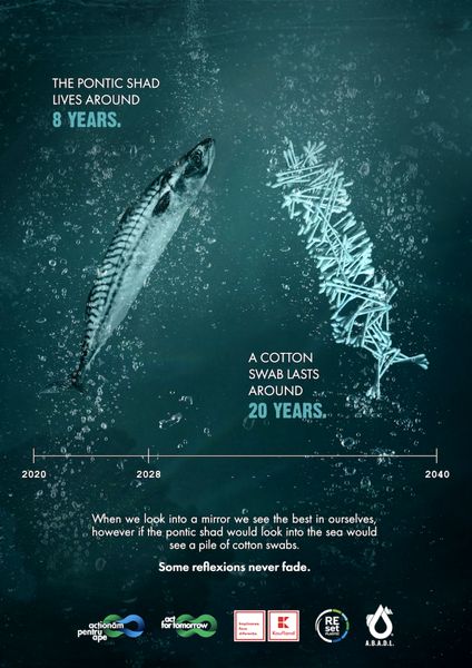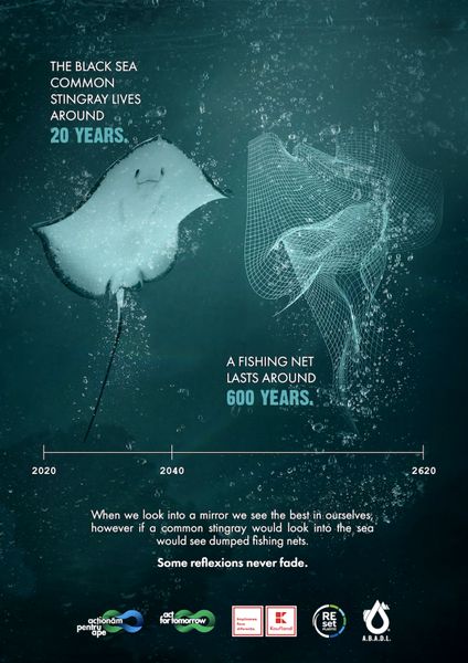 The campaign uses visually impactful images: mirrors the most important threatened and endangered species in the Black Sea, Danube, and Dobrogea, with the most encountered waste in Romanian waters.